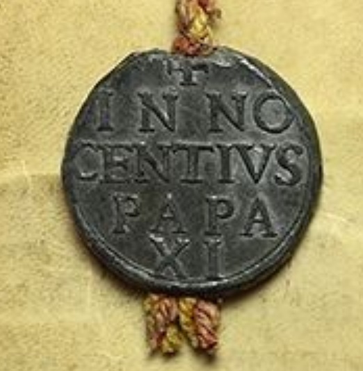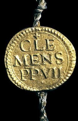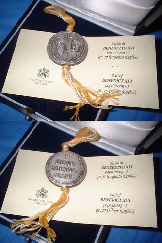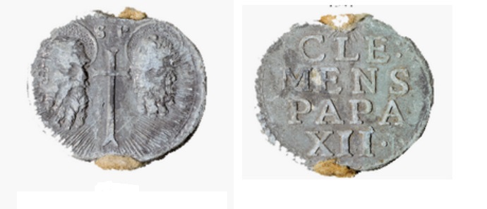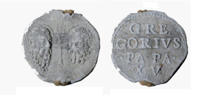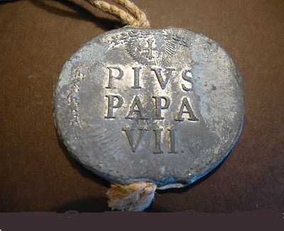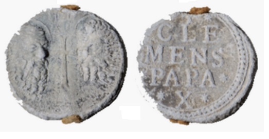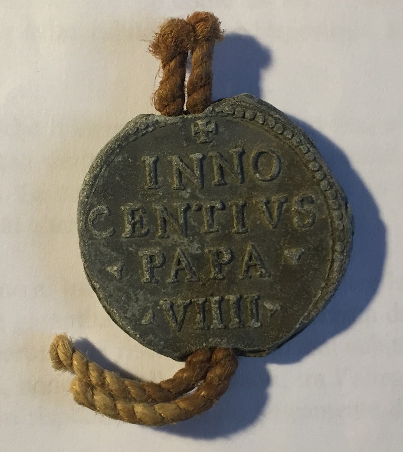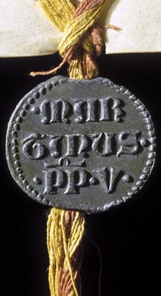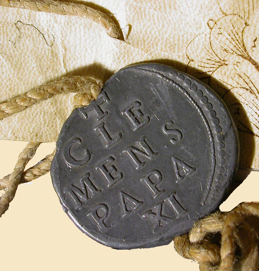 werd samen met een zijde of touwen koord aan het document bevestigd. Pauselijke