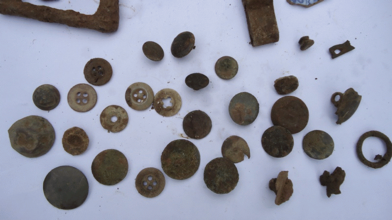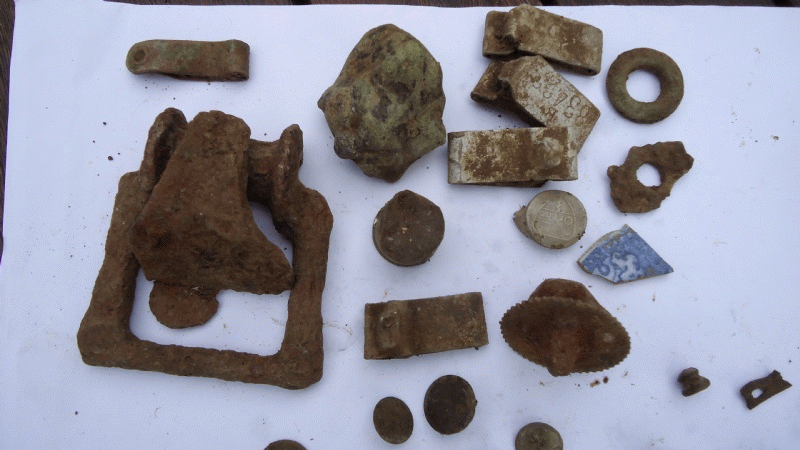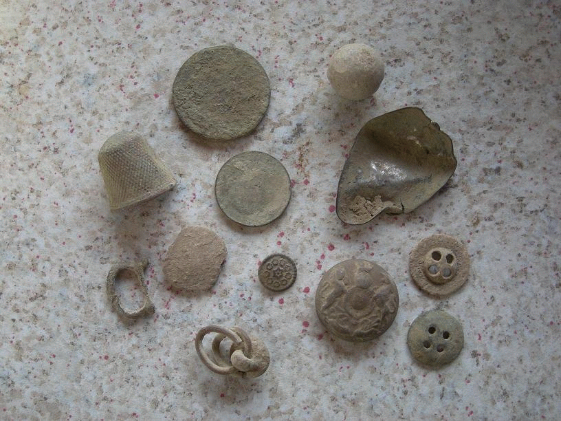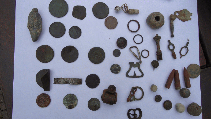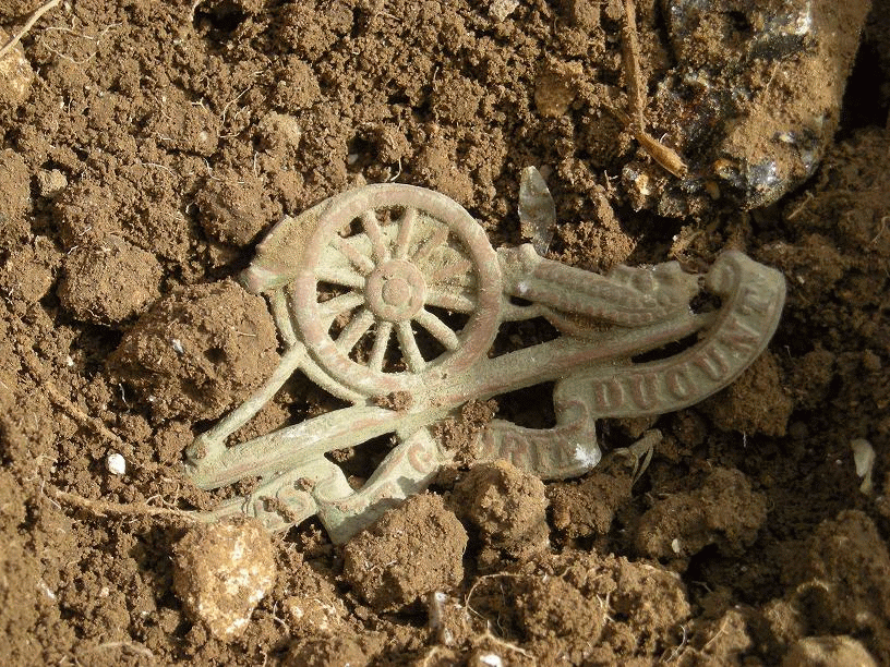 | Spinsteentje vondst Michel | Lepeltje zilver 1890 vondst Dominic | Royal regiment of Artillery knoop1875-1925 vondst John B |