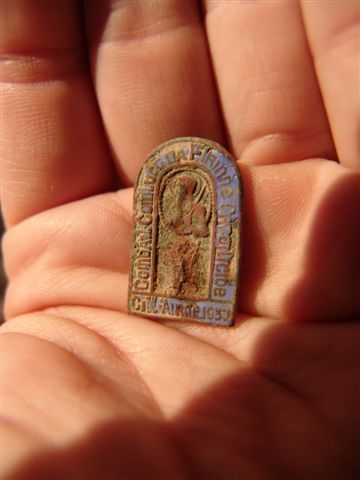 Religieus speldje 1937 vondst Jeroen | Geblazen knoopje 18e eeuw vondst John K |
